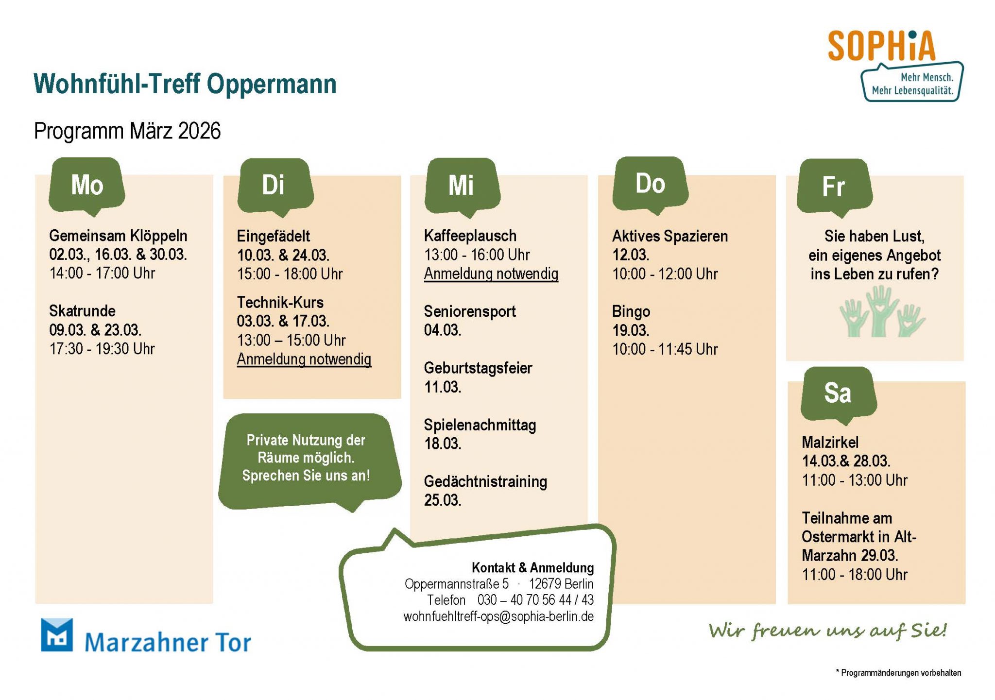 Der Wohnfühltreff der Marzahner Tor in der Oppermannstraße 5 zählt seit April 2024 zur Familie der Nachbarschaftstreffs der SOPHIA. Frei nach dem Motto „Reinkommen und Wohnfühlen“ erwartet Sie ein buntes Programm mit vielen tollen Angeboten und Freiraum zur Gestaltung eigener Angebote. Mit Ihnen gemeinsam wollen wir eine bunte und aktive Nachbarschaft schaffen, in der alle gerne leben.